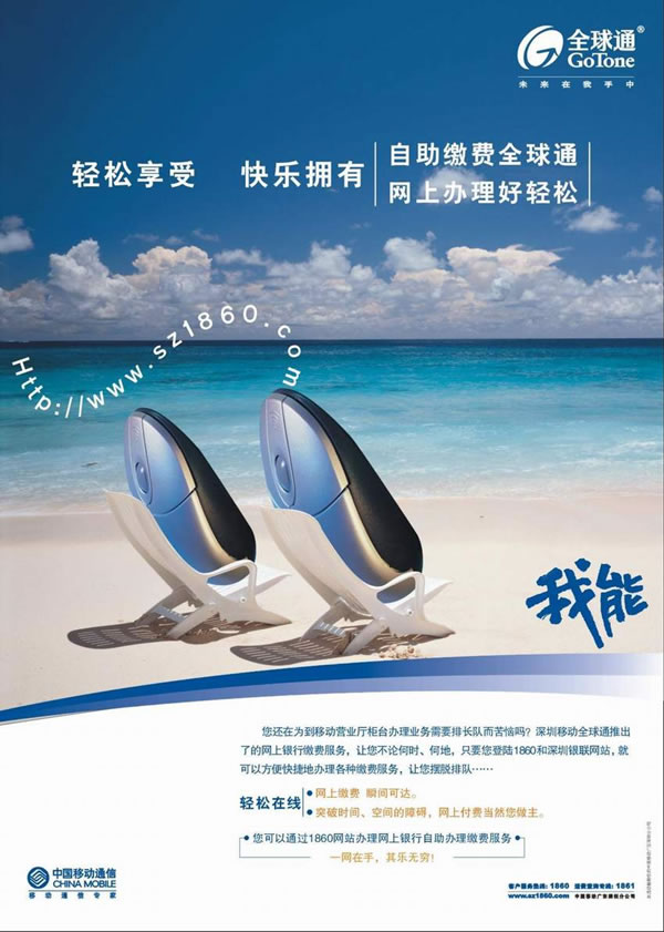 藍(lán)天,白云,一望無(wú)際的海灘,兩張沙灘椅,兩個(gè)鼠標(biāo),人性化地躺在沙灘椅上,很顯然感受到情侶間的溫馨,透射出浪漫的色調(diào)。網(wǎng)絡(luò)繳費(fèi),瞬間可打,體現(xiàn)全球通人輕松愉悅心情和開(kāi)闊無(wú)限的境界。