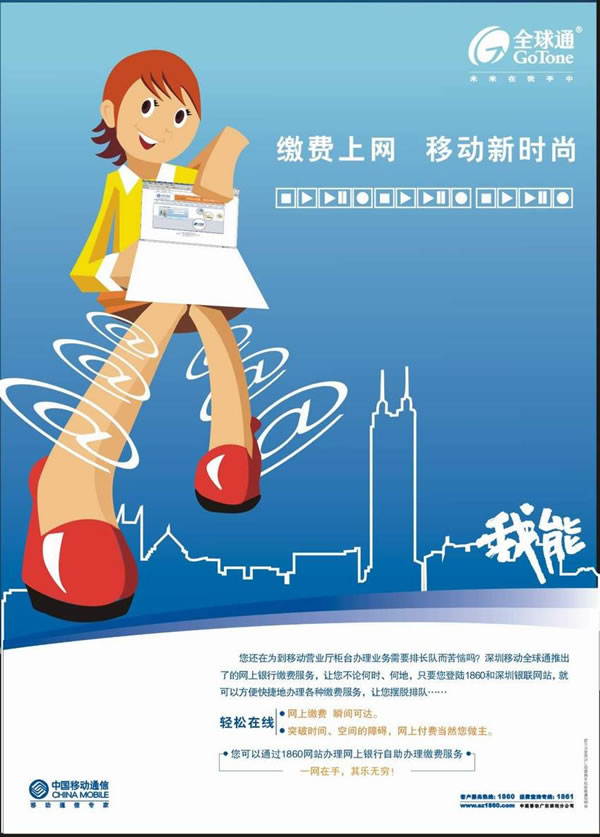 移動(dòng)新時(shí)尚,可以理解為移動(dòng)公司的新時(shí)尚業(yè)務(wù),也可以理解為移動(dòng)人們新的時(shí)尚觀念,引導(dǎo)人們的消費(fèi)觀念。畫(huà)面采用時(shí)尚的卡通人們?yōu)橹鲌D,手握筆記本,展示1860網(wǎng)絡(luò)繳費(fèi)平臺(tái)。而藍(lán)色背景更時(shí)尚,在配上@的網(wǎng)絡(luò)符號(hào)向外轉(zhuǎn)播,形象表現(xiàn)移動(dòng)全球通業(yè)務(wù)的不斷拓展與開(kāi)拓;播放器符號(hào)與深圳標(biāo)志的地王大廈等城市背景,映襯在主畫(huà)面之下,讓人感受到全球通客戶(hù)高端思想與緊跟時(shí)代潮流、品味生活時(shí)尚、用不停步的美好寓意。