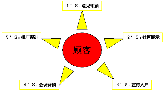 緊接著,為了配合招商工作和現(xiàn)有專賣店的銷售推廣,我們?yōu)锳集團有限公司制定了一套單店推廣計劃。這套計劃主要是以社區(qū)推廣宣傳活動為主,其主要目的是對目標(biāo)消費者尤其是消費意見領(lǐng)袖多角度進行說服教育,使他們深入接受產(chǎn)品概念,為加盟店的銷量上升打基礎(chǔ),同時建立加盟店及其周邊社區(qū)的營銷數(shù)據(jù)庫,為日后的各種公關(guān)或相關(guān)活動收集資料。在這個計劃里,我們提出打破傳統(tǒng)坐在店里賣肉的慣例,走出去賣豬肉的新思路以及5′S社區(qū)推廣體系: