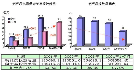 ·鈣產(chǎn)品市場電視媒介投放量每年以66%以上的比例高速增長,2003年全年電視投放總額達(dá)到36.4個(gè)億,2004年1-7月,鈣產(chǎn)品電視廣告投放總量即已達(dá)到了31個(gè)億。