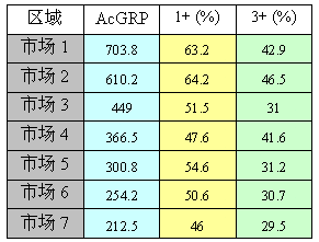 與事先設(shè)定的分區(qū)域的媒介傳播目標(biāo)相一致,保證七大重點(diǎn)市場獲得的總收視點(diǎn)以及1+、3+到達(dá)率。