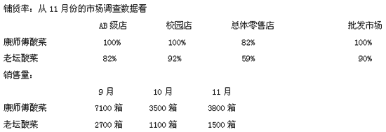2、 康師傅袋面在NC市月均銷量兩萬箱,目前有7支口味;繼現(xiàn)有的紅燒牛肉和辣系列以后,公司希望推出酸菜牛肉從而把酸菜、泡椒、酸辣整合為酸系列;