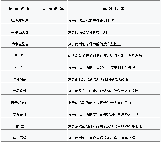注:在此活動(dòng)進(jìn)行過(guò)程當(dāng)中總策劃、總執(zhí)行、總監(jiān)管必須嚴(yán)格負(fù)責(zé)在規(guī)定時(shí)間內(nèi)各項(xiàng)工作的順利進(jìn)行和各部門(mén)的有效銜接。