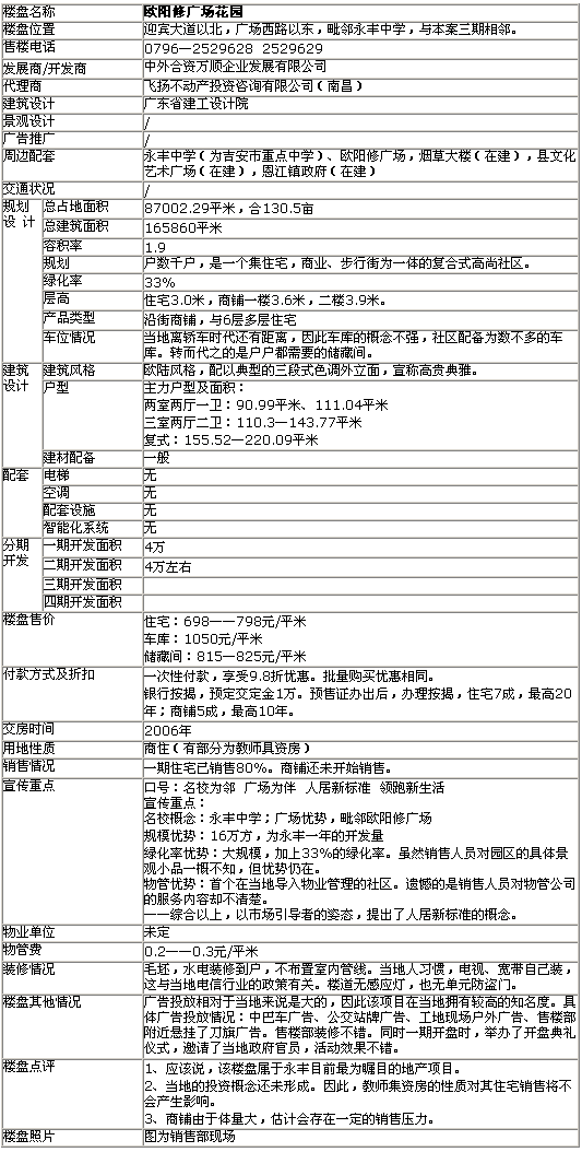 所謂“知己知彼,百戰(zhàn)不殆”,了解對(duì)手,不僅看清了市場(chǎng),也從側(cè)面更加深刻地認(rèn)識(shí)了自己。此部分,我們對(duì)目前永豐在售的幾個(gè)競(jìng)爭(zhēng)樓盤進(jìn)行了調(diào)查,對(duì)于本案的直接競(jìng)爭(zhēng)項(xiàng)目——?dú)W陽(yáng)修花園,則進(jìn)行了重點(diǎn)調(diào)查。