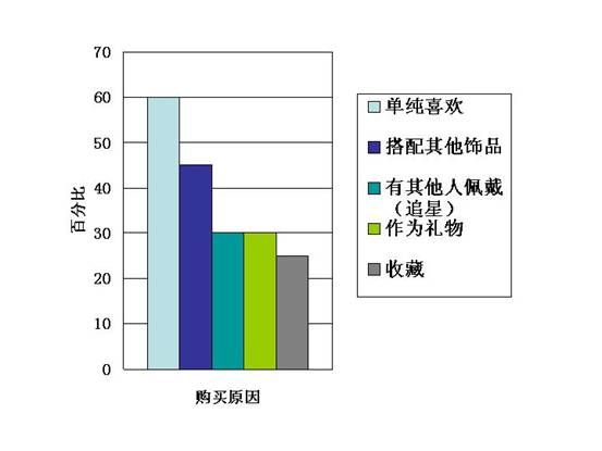消費者在選擇飾品的時候,會在很大程度上考慮它的來源地。從上面的相對比例圖可以看出,來自韓國和日本的飾品占據(jù)明顯的優(yōu)勢。近年來,歌曲、影視劇、時裝韓流輪番襲來,帶動韓國流行元素產(chǎn)品備受中國消費者的青睞。在這種背景下,來自韓國、日本等國的產(chǎn)品紛紛進入中國市場以獲取品牌的持續(xù)發(fā)展。擁有遍布全球一百多家分支機構、一萬余家終端店的韓國樸秀秀飾品集團在對中國飾品市場進行了為期一年的仔細調(diào)研和試運營后也正式進入中國市場,并與劉杰克營銷顧問機構強強聯(lián)手,力爭在最短時間內(nèi)通過商場連鎖及加盟店連鎖體系將樸秀秀優(yōu)質(zhì)低價的產(chǎn)品覆蓋到中國各地。
