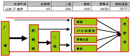 目前我們市場走訪后基本梳理了整個渠道運作模式,該公司渠道架構(gòu)是這樣的(以核心的山東市場為例):