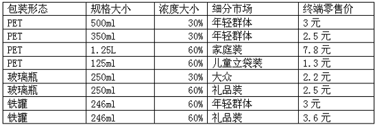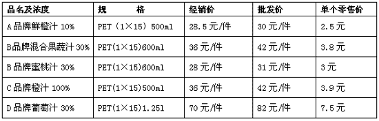 經(jīng)過一番實地走訪和渠道跟蹤調(diào)查,我們基本掌握了該企業(yè)現(xiàn)行的價格狀態(tài),從目前該公司的幾種主導(dǎo)果汁類產(chǎn)品、包裝規(guī)格形態(tài)和各個渠道層級實際拿貨的價格來看,目前渠道成員執(zhí)行的價格體系如下所示: