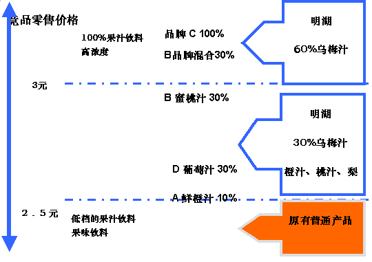 以新品為例,根據(jù)價格比附原則,明湖烏梅汁PET30%500ML和350ML青年即飲裝新產(chǎn)品的市場使命就是切入中高端市場價格線,即市場價格在2.5-3.0元,搶占A品牌、B品牌30%普通系列以及D品牌30%的市場份額;而烏梅汁PET60%的禮品裝就要沖擊高端價格線,搶占B品牌30%混合、C品牌100%的市場份額。從而確立明湖品牌在中高端的市場位次,給消費市場以全新產(chǎn)品、全新品牌的價值感,逐步帶動其他產(chǎn)品系列的價格提升,最終完全替代原有陳舊的價格體系。