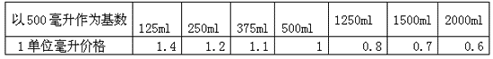 果汁含量為30%的青年裝(設(shè)定PET500ml)的單位毫升價格=0.006元/ml;