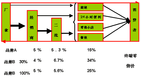 2、經(jīng)銷商、批發(fā)商的利潤率相對競品略低,尤其明顯的是終端利潤空間遠(yuǎn)低于競爭品牌給予終端零售的利潤空間,這必然導(dǎo)致零售商缺乏銷售積極性,在成本固定的前提下,終端零售價偏低,整體處于一種消費者自主選擇的自然銷售狀態(tài)。同時廠家現(xiàn)有的銷售政策和一貫做法就是偏重于對經(jīng)銷商的利潤考慮,他們認(rèn)為一旦經(jīng)銷商訂了貨,那么他們在利潤的驅(qū)使下必然主動去做二批商和終端零售商的工作,二批商只需倒手給零售商賺差價就可以了。然而事實卻不是這樣:經(jīng)銷商雖然主動拿了貨,卻被動銷售,等待廠家給予好的政策或給予差額補償。正是這樣的渠道激勵體系和價格體系,直接導(dǎo)致終端零售商消極推廣,銷量一直低水平徘徊。