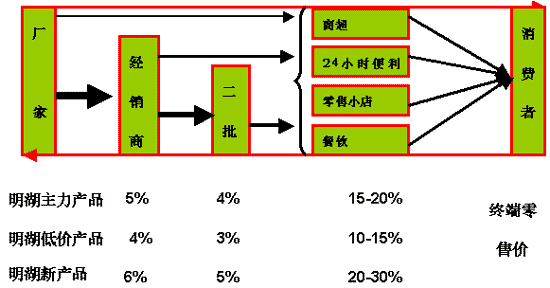 以上該價格只是初步的定價標(biāo)準(zhǔn),或者說只是試銷的價格標(biāo)準(zhǔn),最終定價還要結(jié)合企業(yè)自身的銷售計劃微調(diào),另外還要充分考慮季節(jié)性因素、獎勵促銷政策、返利因素、結(jié)算方式因素等等。實際策劃當(dāng)中,明湖飲料公司就把它作為終端零售價格來執(zhí)行。在此基礎(chǔ)上我們就可以制定渠道成員間的不同層級提貨價格了。根據(jù)前面對競品不同層級渠道成員的利潤規(guī)劃,越靠近消費者利潤空間越高,經(jīng)銷商利潤空間為4-6%,二批的利潤在5-7%,終端零售利潤空間更是非?捎^在15—35%。