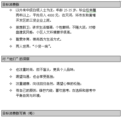 的確,一直以來廣州的樓盤都特別重視35-45歲的強(qiáng)勢購買群體,產(chǎn)品都是針對這批重度購買者來設(shè)計和推廣。尤其這兩年福利分房結(jié)束,更是達(dá)到一個空前的銷量。中?党俏挥趶V園東路九運(yùn)場館西側(cè),一來沒有先天的環(huán)境優(yōu)勢,二來規(guī)模不大,所以不可能大作度假型樓盤文章,而且如果針對二、三次置業(yè)人士,無疑將戰(zhàn)線拉得更長。三來天河是一個新區(qū),而中?党怯衷诮紖^(qū),對老城區(qū)居民的吸引力不足,比起過往開發(fā)的市區(qū)精品住宅條件不同。