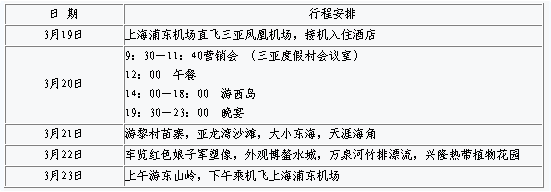 我們的想法是,3月19日客戶全部抵達(dá)三亞后,經(jīng)過(guò)一個(gè)晚上的休息,第二天精神抖擻,正好適合召開營(yíng)銷會(huì)議。所以我們對(duì)3月20日上午的營(yíng)銷會(huì)議進(jìn)行了精心設(shè)計(jì)。