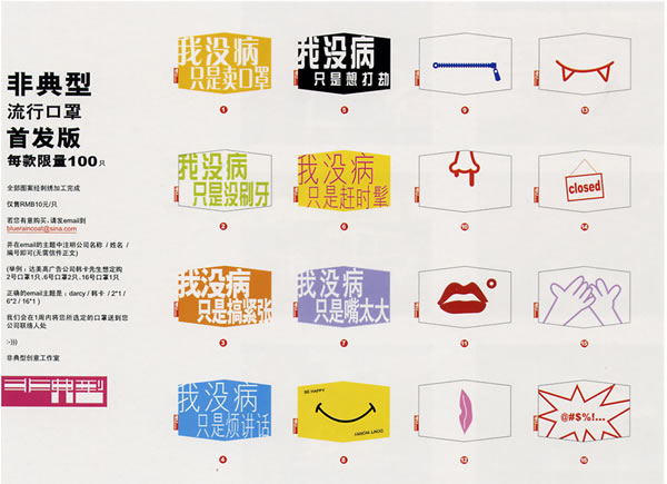 非典型流行口罩首發(fā)版 每款限量100只 1.我沒病,祗是賣口罩 2.我沒病,祗是沒刷牙 3.我沒病,祗是搞緊張 4.我沒病,祗是煩講話 5.我沒病,祗是想打劫 6.我沒病,祗是趕時髦 7.我沒病,祗是嘴太大