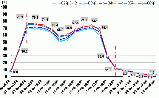 分析2002年至2006年全國(guó)三十個(gè)主要城市內(nèi)城鎮(zhèn)居民總體(以下均簡(jiǎn)稱居民總體)的日常時(shí)間花費(fèi)可見(jiàn),在8:00-19:59期間的12個(gè)小時(shí)內(nèi),居民總體在自己家/親朋家之外(以下均稱為家之外)的區(qū)域停留的時(shí)間越來(lái)越長(zhǎng),如圖二所示。