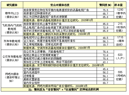 多年來(lái),新生代市場(chǎng)監(jiān)測(cè)機(jī)構(gòu)通過(guò)對(duì)各種“戶外視頻媒體”的專項(xiàng)研究經(jīng)驗(yàn)發(fā)現(xiàn),無(wú)論是“樓宇類戶外視頻媒體”還是“交通類戶外視頻媒體”,一方面,由于其所處媒體環(huán)境都是媒介相對(duì)稀缺的環(huán)境,從而從源頭上減少了其它媒介瓜分目標(biāo)受眾的機(jī)會(huì),為媒體觸達(dá)更多的目標(biāo)受眾創(chuàng)造了有利的條件;另一方面,相對(duì)于樓宇內(nèi)和交通工具上存在的其它靜態(tài)媒體(海報(bào)、條幅、DM等),擁有動(dòng)態(tài)畫面、立體聲音的視頻媒體,更容易吸引目標(biāo)受眾主動(dòng)關(guān)注,受眾對(duì)媒體接受度、認(rèn)知度高(如表一所示),從而確保媒體的有效到達(dá)。