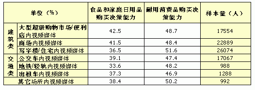 表五:各細(xì)分戶外視頻媒體周到達(dá)人群消費(fèi)決策權(quán)