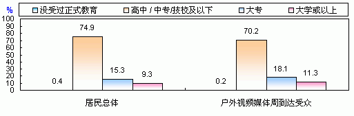 而從受眾的受教育程度來(lái)看,“戶外視頻媒體”的受眾中,受過(guò)大專及以上高等教育的人群比例明顯高于居民總體。
