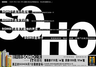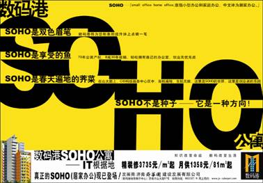 根據(jù)我們的目標(biāo)消費(fèi)群知識(shí)層位較高,年輕、接受新事物的能力比較強(qiáng)的特點(diǎn),與濟(jì)南各種中高檔房地產(chǎn)項(xiàng)目都以尊貴、幽雅等作為宣傳目標(biāo),創(chuàng)意訴求圍繞戶型、綠化以及配套設(shè)施方面進(jìn)行宣傳的方式區(qū)隔開,把數(shù)碼港定位為“IT根據(jù)地”{這里是濟(jì)南重要的城市功能區(qū)——CID,是IT創(chuàng)業(yè)者生活與工作的地方;從適合居家辦公的SOHO戶型到“數(shù)碼港風(fēng)情街”等配套設(shè)施的完善,都著力描述了一個(gè)IT界人士自己的生活圈,同時(shí)提出“知識(shí)改變命運(yùn),數(shù)碼改變生活”的項(xiàng)目口號(hào)。