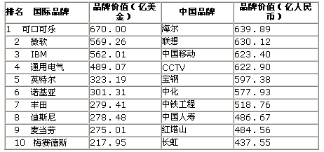 掀開2006年度《商業(yè)周刊》公布的“全球最有價(jià)值100品牌榜”及2006年度世界品牌實(shí)驗(yàn)室公布的“中國(guó)500最具價(jià)值品牌榜”,透過兩組數(shù)據(jù)的對(duì)比,我們不難看出中國(guó)品牌與國(guó)際品牌的差距。