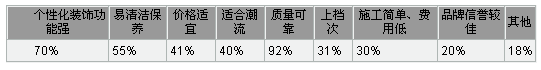 從上表中可看出,消費(fèi)者在選擇建材家居產(chǎn)品的時候,會將易清潔、耐用、經(jīng)濟(jì)等原始功能與個性化裝飾效果、時尚潮流、高檔等體現(xiàn)個人愛好與品位檔次的需求,雙重結(jié)合起來一同考慮。