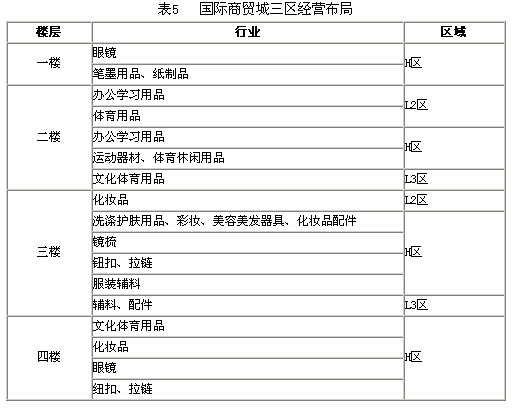 備注:市場經(jīng)營管理、服務機構完善,為市場運營提供保障。除主體市場外,市場在功能規(guī)劃中還包括:生產(chǎn)企業(yè)直銷中心、商品采購中心、倉儲中心、餐飲中心、特色館和外貿機構,提供餐飲美食、電信服務、中庭休閑、金融服務、物流運輸?shù)确⻊;市場內設中央空調、大型電子信息屏、廣播系統(tǒng)、電子信息咨詢系統(tǒng)、寬帶網(wǎng)絡系統(tǒng)、自動扶梯、消防安全監(jiān)督控制中心;