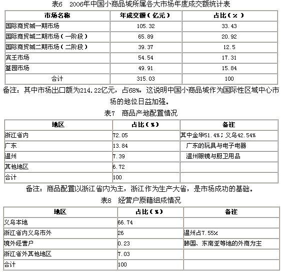 中國小商品城創(chuàng)建于1982年,是我國最早創(chuàng)辦的專業(yè)市場之一。25年來,經(jīng)歷五次搬遷九次擴建,現(xiàn)擁有營業(yè)面積260萬平方米,由中國義烏國際商貿城、篁園市場、賓王市場三個市場簇群組成,商位58000余個,從業(yè)人員10萬多,日客流量20多萬人次。2006年市場總成交額達315.03億元,其中外貿出口占60%強,自1991年始連續(xù)16年位居全國工業(yè)品批發(fā)市場榜首。