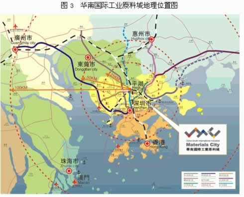 從圖3地理位置圖中我們可以看出,華南城地處深圳市與東莞市的交界地,兩市均在商圈輻射之內。深圳市與東莞市強大的制造業(yè)大量的工業(yè)原料需求為華南城的發(fā)展奠定了充實的基礎。