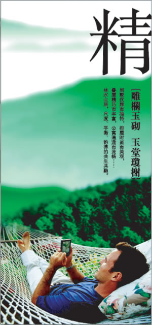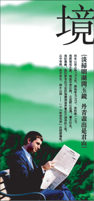 在項目的平面設(shè)計風(fēng)格表現(xiàn)中,設(shè)計師將主色調(diào)定為代表自然界的綠色和代表時尚現(xiàn)代生活的橙色兩種色調(diào),大塊鮮明跳躍的橙色塊穿插于充溢眼底的清新綠色之中,既蘊涵著項目“聆天籟之音、聞學(xué)院書香”的清新自然感,又將目標(biāo)客戶群對于時尚事物的追尋和認(rèn)同融入其中,設(shè)計表現(xiàn)風(fēng)格打破了許多傳統(tǒng)樓盤表現(xiàn)風(fēng)格單一的局限性,橙綠對比的鮮明色彩很容易吸引受眾的眼球。特別是對項目核心概念的平面表現(xiàn),設(shè)計師在尊重項目原有的建筑設(shè)計效果圖的基礎(chǔ)上,選取了一些意境優(yōu)雅的山水風(fēng)景圖案,以及與目標(biāo)消費者的身份相符的“悠然生活狀態(tài)”的形象代言,作為主要的訴求方式,營造出一種令人向往的全新居家生活意境,清新的格調(diào)與時尚的形式互為交融,產(chǎn)生了具有連貫性的表現(xiàn)傳達效果。