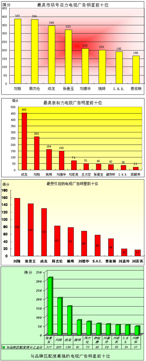 上海市民心目中的中國電視廣告明星調(diào)查,主要是從受眾、消費者的角度來進行測評,讓上海市民評選出自己心目中最具親和力電視廣告明星;與代言產(chǎn)品品牌最匹配電視廣告明星;最具市場號召力電視廣告明星;最受歡迎電視廣告明星等