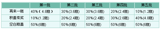 3、中獎(jiǎng)比例,第一批酒中,電動(dòng)車設(shè)兩輛,“再來一瓶”設(shè)為40%,“積蓋有獎(jiǎng)”設(shè)為10%,其余50%的瓶蓋空白;