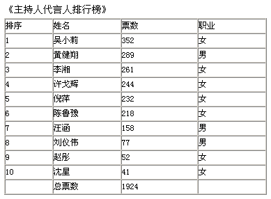 主持人雖然有1人上榜,但是汪涵也創(chuàng)下了一個低票紀錄——由他代言的澳洲鳥服飾,只得到19票。
