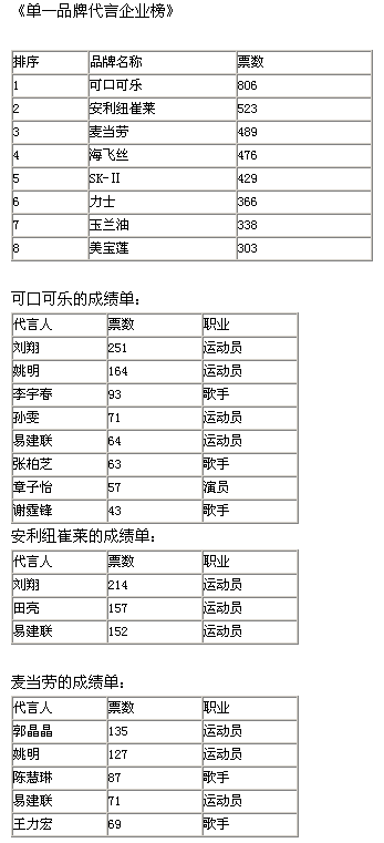 通過《食品行業(yè)最佳代言人排行榜》可以看到,運動員的排名基本在前列。尤其是劉翔,分別為白沙(277票)、可口可樂(251票)、安利紐崔萊(214票)、伊利(159票)代言,得到了901票,在所有食品行業(yè)代言人當中票數最高。田亮(美好時光海苔、安利紐崔萊)、姚明(可口可樂、麥當勞)、郭晶晶(喜之郎、麥當勞)均有兩個代言的品牌上榜。