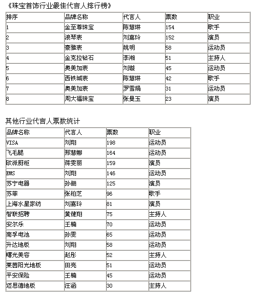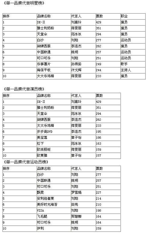 根據上榜明星為單一品牌代言的得票數,本次報告排出了食品、日化、IT、服飾、家電、藥品、珠寶首飾等7個行業(yè)的最佳代言人排行榜。這7個行業(yè)排在第一位的最佳代言人分別是:蔣雯麗(食品行業(yè))、劉嘉玲(日化行業(yè))、姚明(IT行業(yè))、范冰冰(服飾行業(yè))、許戈輝(家電行業(yè))、吳小莉(藥品行業(yè))、陳慧琳(珠寶首飾行業(yè))。