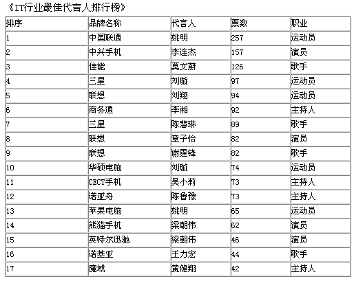在IT行業(yè),為單一品牌代言的14位明星中,得票數最高的三人是姚明(代言中國聯通,257票)、李連杰(代言中興手機,157票)、莫文蔚(代言佳能,126票)。