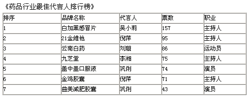 在藥品行業(yè)最佳代言人中,主持人3人、演員1人、運動員1人,歌手一個也沒有。