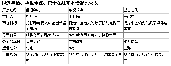 在公交移動電視市場中,除了東方明珠和北廣傳媒固守上海和北京兩大中心地區(qū)外,目前在全國形成戰(zhàn)略布局的是三家民營企業(yè),他們分別是世通華納、華視傳媒和巴士在線,他們通過在全國謀旗布局,形成了公交移動電視市場的三駕馬車,在全國市場開展了正面競爭,以爭奪處于快速增長中的移動電視市場蛋糕。