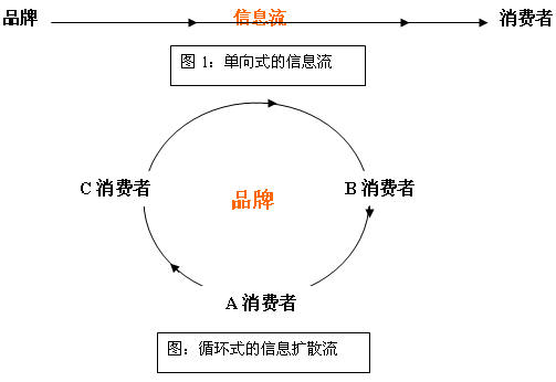 但在新的傳播環(huán)境中,未來(lái)的營(yíng)銷信息流將是一種循環(huán)式的信息擴(kuò)散傳播——將信息變得更具體驗(yàn)性,每一個(gè)接觸信息源的消費(fèi)者都會(huì)被信息內(nèi)容、傳遞方式或者呈現(xiàn)的結(jié)果所打動(dòng),繼而自己產(chǎn)生對(duì)信息進(jìn)行再次擴(kuò)散的愿望,從而實(shí)現(xiàn)了信息的二次擴(kuò)散。這對(duì)企業(yè)而言,不僅大大節(jié)約了傳播的費(fèi)用,更重要的是人際網(wǎng)絡(luò)之間的信息傳播其有效性及接收率將更高。圖1與圖2所呈現(xiàn)的就是單向式信息流與循環(huán)式信息擴(kuò)散的區(qū)別。