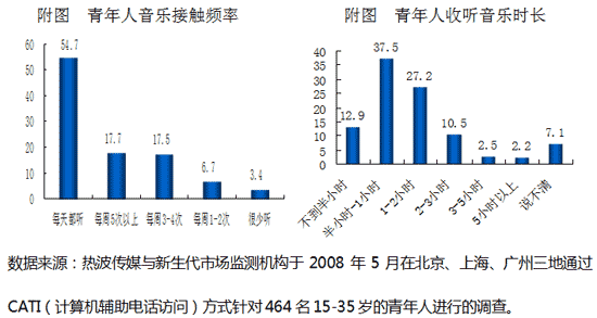 對于15到35歲的青年人而言,音樂已經(jīng)是非常普遍的愛好,在熱波傳媒和新生代市場監(jiān)測機(jī)構(gòu)近期開展的青年人調(diào)查顯示,54.7%的青年人每天都在聽音樂,接近20%的青年人每周聽5次以上,而且,他(她)們每天收聽音樂的時(shí)間都在一個(gè)小時(shí)以上。其中,“85后”每天接觸音樂時(shí)間最久,平均為1小時(shí)15分,即便是“70后”,他(她)們平均每天接觸音樂的時(shí)間也有37分鐘!