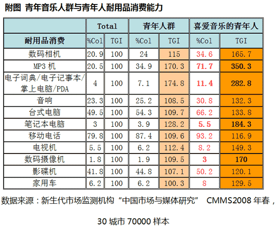 而如果拿最具標(biāo)志性的耐用消費(fèi)品來比較青年人群的消費(fèi)價(jià)值,數(shù)據(jù)顯示,喜愛音樂的青年人擁有高于其他群體的消費(fèi)能力與消費(fèi)價(jià)值,喜好音樂的青年人對于數(shù)碼相機(jī)、電子詞典/電子記事本/掌上電腦/PDA、音響、家用車、MP3機(jī)、筆記本電腦、移動(dòng)電話、電視機(jī)、數(shù)碼攝像機(jī)等耐用品的購買欲望更加突出.。