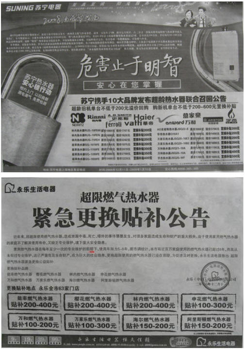 今天照例翻看《新聞晨報(bào)》,欣喜的發(fā)現(xiàn),國(guó)內(nèi)家電零售業(yè)的兩大巨頭蘇寧和國(guó)美(永樂(lè))反應(yīng)速度也很快,分別以半版的篇幅刊登了燃?xì)鉄崴鞯母鼡Q貼補(bǔ)的促銷活動(dòng)。