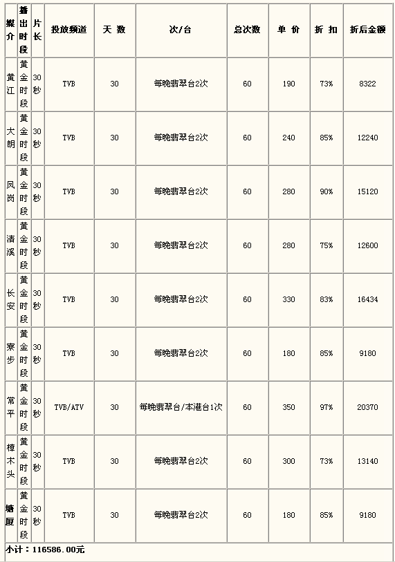 ①塘廈周遍廣告投放費預(yù)計:116586.00元,費用分布詳見下表: