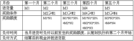 1、針對終端月度進貨量,進行層級返利政策,首先制定了單此進貨獎勵制度如下: