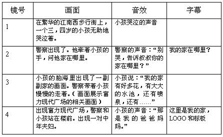 小孩是父母的寶貝,誰都不希望他/她的孩子迷路。在廣告中設(shè)計一個小孩迷路的情景,貼切目標(biāo)群體(中年成功人士)的實際情況。通過小孩對“家”的描述,展示了富力現(xiàn)代廣場的內(nèi)部設(shè)施和環(huán)境設(shè)施。最后小孩成功的回到家中,暗含了其獨特的建筑風(fēng)格魅力。