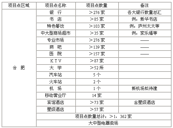 目前,從該產(chǎn)品---手機(jī)加油站第一階段鋪貨的網(wǎng)點(diǎn)來分析,合肥市人流量大、文化品味高、停留時(shí)間較長(zhǎng)、有利于形成雙方美譽(yù)度提升的場(chǎng)所簡(jiǎn)析如下:A/B類餐飲網(wǎng)點(diǎn)、銀行、醫(yī)院、證券市場(chǎng)、咖啡廳、茶吧、連鎖/超市、書店、移動(dòng)營(yíng)業(yè)廳、電器/通訊產(chǎn)品賣場(chǎng)等;诖,我們對(duì)合肥市以上場(chǎng)所的數(shù)量做以下梳理: