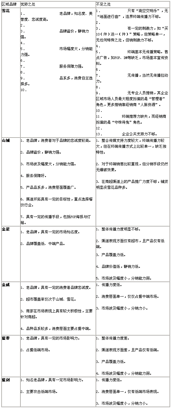從上表可以看出,5大品牌均具有產品價值力和產品靜銷力,這也是品牌生存的基礎。但是,區(qū)域市場的終端最終表現卻各不相同,市場占有率:雪花45%,山城40%,其它15%。