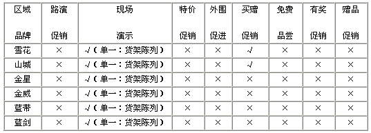 針對以上模型,跨越巔峰項目調(diào)研組對該啤酒市場的促銷手段進(jìn)行了深度調(diào)研并作出診斷(具備√ 缺乏×):