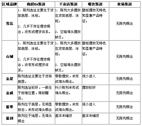 1.陳列選址不正確。以雪花為例,一般其產(chǎn)品位置處于貨架底層,使消費者不易選取。
