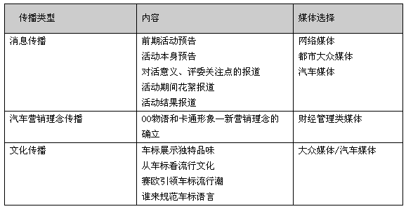 ² 以有社會(huì)影響力的都市類(lèi)大眾媒體、汽車(chē)專(zhuān)業(yè)媒體、時(shí)尚媒體媒體作為選擇重點(diǎn),同時(shí)配合網(wǎng)絡(luò)進(jìn)行線(xiàn)上、線(xiàn)下的全方位傳播。