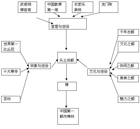 “所以用‘禪’來概括成都的城市文化可謂點(diǎn)晴之筆。既具有繼承性,將成都平民化的文化休閑生活氛圍包容,又具有國際性,在建筑、藝術(shù)、宗教上成為東方文化的代表。將本案文殊院的佛教文化引伸為禪文化,以此為定位,方能聚集起成都紛繁蕪雜的文化生活資源,同時(shí)以禪文化無可比擬的包容性,整合進(jìn)古今中外的文化生菜,在以成都為背景,文殊院為基點(diǎn)的禪文化大鍋中,涮出一鍋旅游文化的大餐來!”